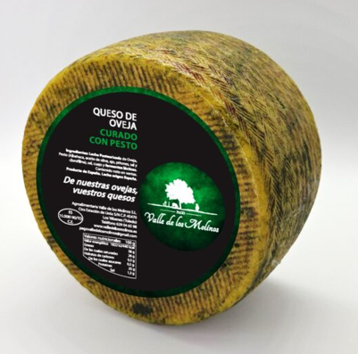 El queso curado con pesto se elabora de manera artesanal con leche pasteurizada de oveja. Tras la coagulación y el corte en granos, la cuajada se moldea y madura durante 5 meses en bodega, donde desarrolla una corteza natural y una pasta compacta.